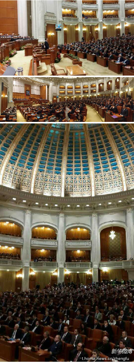 據中國政府網官方微博報道,周三下午,籠罩在初雪中的羅馬尼亞議會宮全會廳座無虛席,羅全體議員屏息聆聽李克強總理在此發表演講。演講中,他親切幽默的演講風格引發聽眾陣陣掌聲。不足半小時的演講被20次熱烈的掌聲打斷。演講結束,在場聽眾全體起立,掌聲在這座世界最大的議會宮經久回響。