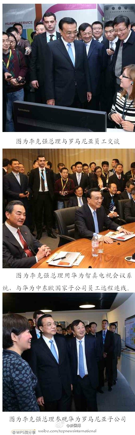 據新華社“新國際”微博報道,國務院總理李克強27日下午視察華為羅馬尼亞子公司。經過10年運營,華為目前在羅電信綜合市場占有率排名第一。華為羅馬尼亞子公司百分之七十是當地員工,為當地創造了大量就業崗位,是中歐互利共贏的寫照。