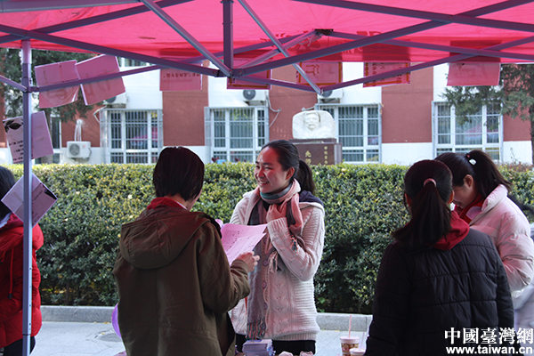 北京師范大學兩岸四地青年交流協(xié)會的學生們早早地來到體育館外布置攤位,他們?yōu)閮砂端牡厍嗄杲涣魉龅呐Γ缤柟庠谶@個寒冷的初冬讓人感到溫暖。