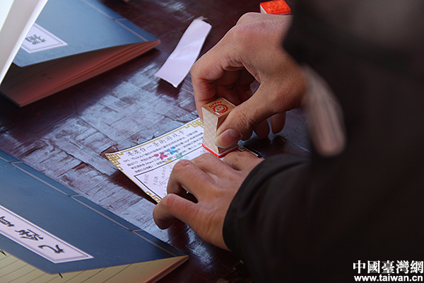 在游戲紙上收集印章兌換紀念品(中國臺灣網(wǎng) 記者 崔瀝心 攝)