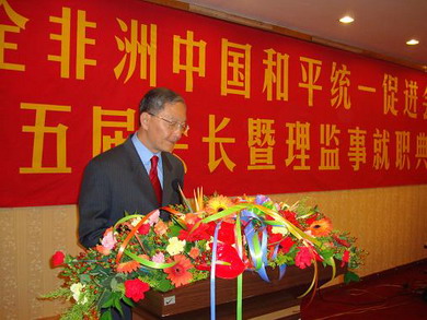 鐘建華大使在致辭中表示,全非洲中國和平統一促進會成立以來,一直堅決反對“臺獨”,團結擁護一切擁護祖國和平統一的全非華僑華人,在全非大陸十幾個國家成立和統會,已成為非洲大陸一面反獨促統的旗幟。