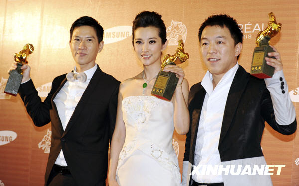 11月28日,金馬獎最佳女主角獎獲得者李冰冰(中)和金馬獎最佳男主角獎獲得者張家輝(左)、黃渤合影。當日,第46屆臺灣電影金馬獎頒獎典禮在臺北舉行。新華社發(吳景騰 攝)