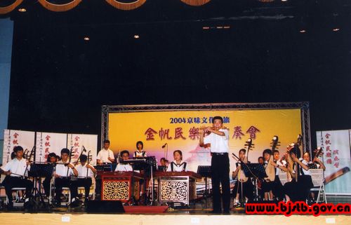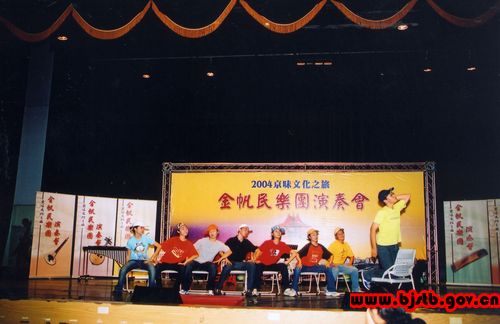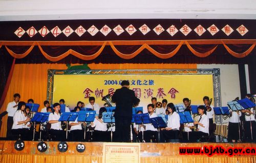 承擔此次赴臺的京味文化之旅民樂表演的是我市第十二中學的金帆民樂團,別看他們都是普通的中學生,但進行民樂的學習已有多年的歷史,他們的演奏水平一點不比專業樂團遜色,他們曾多次在全國的民樂比賽中獲獎,并多次代表我市中學生參加國際的藝術交流活動,弘揚民族藝術。這次來到祖國寶島臺灣,他們的表演更是精彩。一曲《京調》仿佛使人們在觀賞一臺京劇表演,聯想起那字正腔圓的唱詞、陰陽頓挫的過門;《春將花月夜》本是傳統音樂中的“山水名曲”,在這首樂曲的伴奏下,朗誦一篇散文,把北京的風景名勝向大家做一介紹也別有一番意境;一段彈撥樂《賽馬》又把觀眾帶到中國北方的大草原,好象親眼看到賽馬時烈馬奔馳、熱烈歡快的景象;《夜深沉》是京劇《霸王別姬》中的一個曲牌,也是全場演出中難度最大的曲目,京胡的一張一弛表達了虞姬和項羽訣別的剎那,琵琶和揚琴的一緊一慢表達出虞姬舞劍時的慷慨激憤,大鼓的一招一試又有如萬馬奔騰的疆場,整曲流暢激昂、一氣呵成。場內觀眾興致勃勃地欣賞著演出,對小演員演奏出的美妙聲音所折服,特別是當樂隊演奏臺灣同胞熟悉的《童年》、《丟丟銅》等臺灣民謠樂曲時,他們的情緒更加高漲,掌聲一浪高過一浪。每場演出結束前,樂隊的主持人都不忘向全體觀眾發出邀請,希望2008年相約北京奧運會。