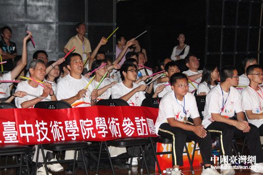 臺中技術學院的同學們面帶微笑,搖動著熒光棒,不時賣力地鼓掌。(中國臺灣網 鐘寶華 攝 )