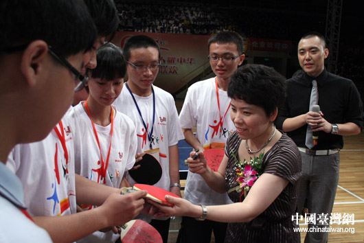 京臺兩地各派出學生代表與鄧亞萍進行了乒乓球友誼賽。(中國臺灣網 鐘寶華 攝 )