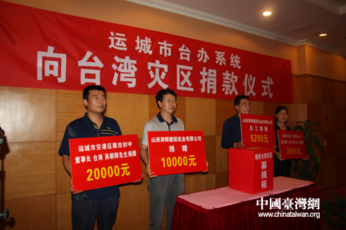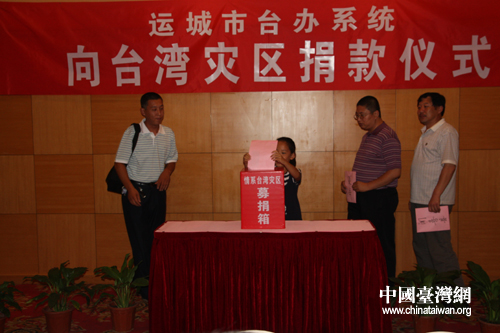 運(yùn)城市臺(tái)辦主任董澤民在捐款活動(dòng)上表示,自從8月8日臺(tái)風(fēng)“莫拉克”侵襲臺(tái)灣中南部地區(qū)以來,運(yùn)城市各界群眾紛紛通過電話、書信等方式向臺(tái)辦部門了解受災(zāi)地區(qū)情況,咨詢捐款事宜。今天借此機(jī)會(huì)我們帶來了全市人民的愛心、誠心,希望通過大家的共同努力幫助災(zāi)區(qū)同胞渡過難關(guān)。