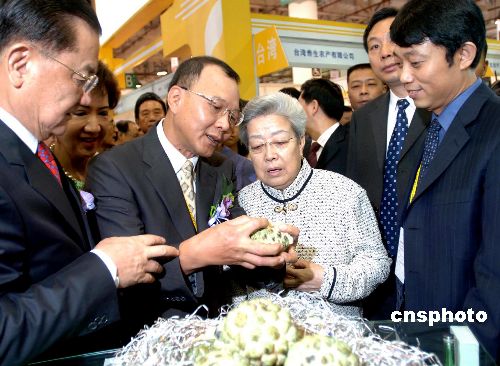 “海峽兩岸農業成果展覽暨項目推介會”2006年10月19日在廈門舉行。參展的臺灣客人向國務院副總理吳儀介紹水果新品。中新社發 鄭祚聲 攝