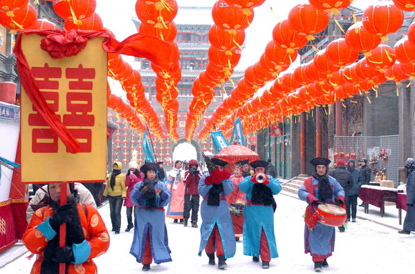 這是沈陽棋盤山關(guān)東影視城內(nèi)再現(xiàn)上世紀二三十年代的迎親場面