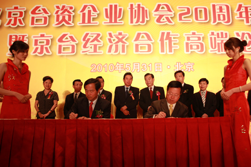 中國臺灣網5月31日北京消息 北京臺資企業協會成立二十周年慶典活動暨京臺經濟合作高端論壇31日在京舉行,圖為北京市臺協與島內行業團體簽署合作協議。(中國臺灣網 趙輝 攝)