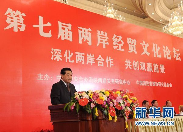 5月8日,第七屆兩岸經(jīng)貿(mào)文化論壇在四川成都閉幕。中共中央政治局常委、全國政協(xié)主席賈慶林和中國國民黨榮譽(yù)主席吳伯雄出席閉幕會。這是中共中央政治局常委、全國政協(xié)主席賈慶林致辭。新華社記者 饒愛民 攝