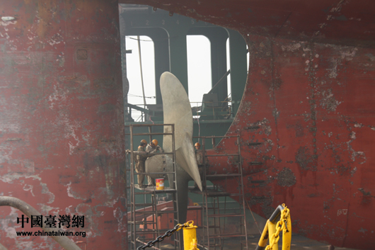 正在中遠(yuǎn)川崎維護(hù)的南通號(hào)15萬(wàn)噸級(jí)巨輪。圖為巨輪螺旋槳部分。 (中國(guó)臺(tái)灣網(wǎng) 王偉 攝)