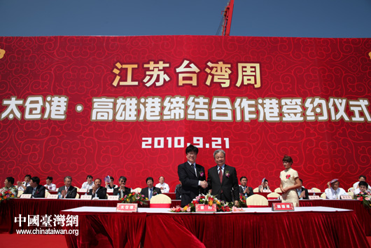 中國臺灣網9月21日太倉消息 9月21日,作為江蘇省臺灣周系列活動之一,在太倉港三號碼頭,太倉港與高雄港正式簽約締結為“姐妹港”。標志著太倉港參與臺灣經濟領域的合作將進一步加強,在蘇臺經貿合作中進一步放大核心港作用。合作雙方表示,將加快構建兩岸之間的物流走廊。