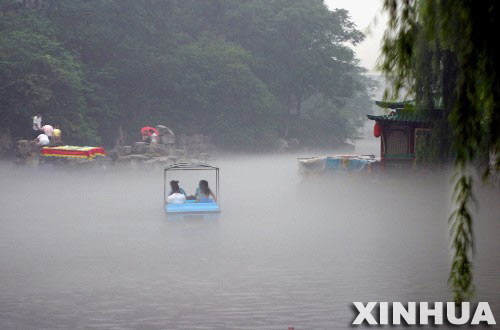 8月28日,游人在云霧繚繞的護(hù)城河上劃船。