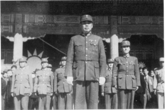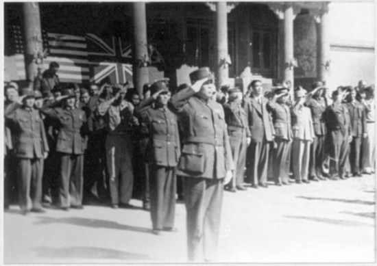 中國受降主官召日軍投降代表華北方面軍司令官根本博中將率領參謀長高橋坦以下廿一員幕僚入場。