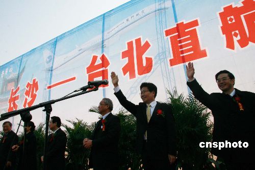 一月十五日下午,滿載一百七十名乘客的廈門航空MF889航班從長沙黃花機場起飛,湖南長沙至臺北客運直達航班正式開通。湖南省委書記張春賢(右二)、湖南省長周強(右一)、海協會副會長張銘清(右三)出席首航儀式。長沙至臺北航線目前定為每周四一班,在長沙起飛時間為下午三點五十,六點抵達臺北;返程起飛時間為下午七點,九點二十分到達長沙。 中新社發 劉雙雙 攝