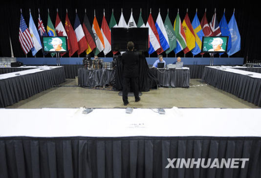 9月22日,在美國匹茲堡G20金融峰會新聞中心,技術人員調試視頻設備。新華社記者戚恒攝