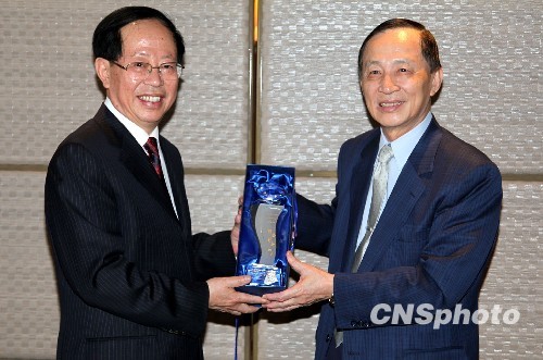 5月20日,海峽兩岸農(nóng)業(yè)交流協(xié)會與臺灣二十一世紀(jì)基金會在臺北舉行座談會,并簽訂2010年合作備忘錄。圖為二十一世紀(jì)基金會董事長、前臺南縣長高育仁(右)向首度訪臺的海峽兩岸農(nóng)業(yè)交流協(xié)會名譽(yù)會長危朝安贈送禮品,禮品上刻“研發(fā) 創(chuàng)新 和平”等字樣。 中新社發(fā) 董會峰 攝