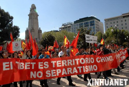 4月14日,西班牙上千名華人華僑和留學(xué)生在馬德里市中心的西班牙廣場(chǎng)舉行游行集會(huì)活動(dòng),反對(duì)西藏分裂,反對(duì)西方歪曲報(bào)道,維護(hù)統(tǒng)一,支持北京奧運(yùn)。 新華社記者陳海通攝