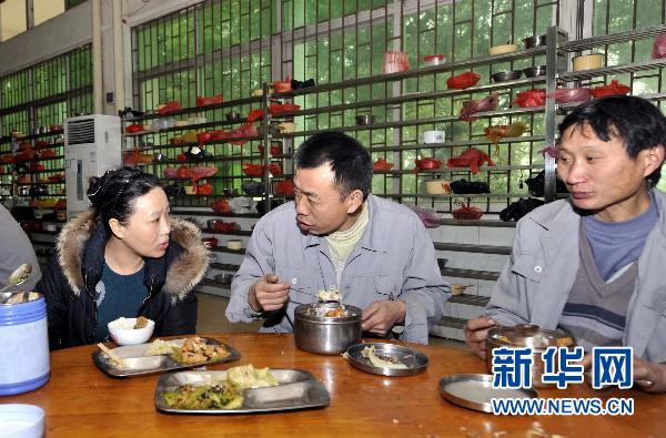 農(nóng)民工全國(guó)人大代表胡小燕——為全國(guó)兩會(huì)做好準(zhǔn)備胡小燕(中)在公司生產(chǎn)車(chē)間食堂和工友們交流(2月16日攝)。在廣東佛山打工十幾年,胡小燕獲得過(guò)公司所在地白坭鎮(zhèn)“十佳外來(lái)工”、三水區(qū)“十佳外來(lái)工”、佛山市“十佳外來(lái)工”稱號(hào),2008年1月21日,經(jīng)過(guò)廣東省十一屆人大一次會(huì)議第三次全體會(huì)議無(wú)記名投票,她成為中國(guó)第一位農(nóng)民工全國(guó)人大代表。胡小燕現(xiàn)在在佛山市三水新明珠建陶工業(yè)有限公司工作。在完成日常工作的同時(shí),她認(rèn)真地履行職責(zé)。去年兩會(huì),她提交了5項(xiàng)涉及農(nóng)民工權(quán)益的建議,諸如醫(yī)保轉(zhuǎn)移、子女教育、技能培訓(xùn)、工傷賠付等。一年來(lái),她所關(guān)注的還是農(nóng)民工子女入學(xué)、空巢老人等與農(nóng)民工息息相關(guān)的議題。全國(guó)兩會(huì)在即,胡小燕也在積極為兩會(huì)做著最后的準(zhǔn)備。新華社記者 陳曄華攝