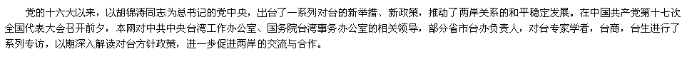 中國臺灣網10月3日北京消息 中國共產黨第十七次全國代表大會召開前夕,中共中央臺灣工作辦公室、國務院臺灣事務辦公室主任陳云林接受了中國臺灣網記者的專訪。陳云林主任指出,黨的十六大以來的五年,是對臺工作十分不平凡的五年,是兩岸關系在曲折起伏中向前發展的五年。以胡錦濤同志為總書記的黨中央從全局和戰略的高度重視和加強對臺工作,針對臺海局勢的新變化,就新形勢下的對臺工作作出一系列重大決策和部署,提出一系列新主張,采取一系列新舉措,領導我們緊緊圍繞反對和遏制“臺獨”這一首要任務,牢牢把握兩岸關系和平發展的主題,堅決打擊和遏制“臺獨”分裂勢力及其活動,擴大兩岸經濟文化交流和人員往來,推動了直接“三通”的進程,打開了兩岸政黨交流新局面,進一步爭取了國際社會對中國政府關于臺灣問題方針政策的理解和支持,捍衛了國家主權和領土完整,維護了臺海地區和平穩定。
