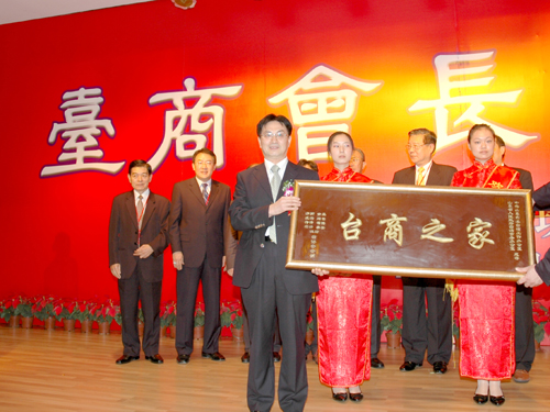 2006年8月30日,山東省臺(tái)辦主任楊慶文接受臺(tái)商會(huì)長們贈(zèng)送“臺(tái)商之家”牌匾 |