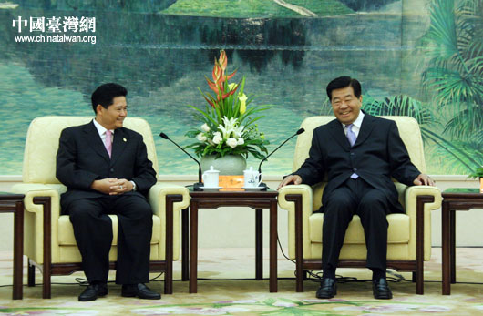 7月27日下午,中共中央政治局常委、全國政協主席賈慶林在北京人民大會堂會見了以鄭銘坤先生為團長的臺灣媽祖聯誼會代表團一行 。(中國臺灣網 鐘寶華 攝)