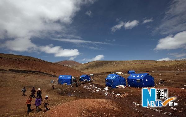 當(dāng)日,記者從青海玉樹縣結(jié)古鎮(zhèn)前往隆寶鎮(zhèn)采訪,一路上發(fā)現(xiàn),無論是在路邊的災(zāi)區(qū)群眾安置點還是深山草甸,都能看到飄揚(yáng)的五星紅旗和黨旗,看到解放軍和武警戰(zhàn)士們忙碌的綠色身影,看到政府發(fā)放的藍(lán)色帳篷。在無情的地震過后,在廢墟和藍(lán)天白云之間,紅色、綠色和藍(lán)色總能讓人心頭涌起一股暖流。新華社記者 費茂華攝