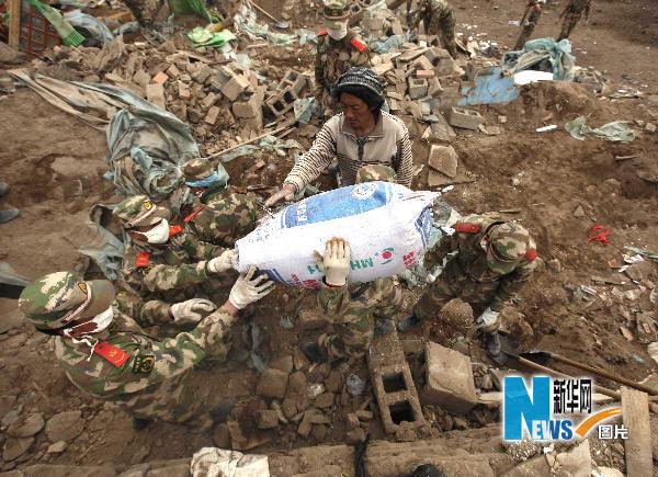 4月22日,武警戰(zhàn)士幫助牧民鐵尕把家中的財物從廢墟中清理出來。新華社記者 費茂華攝