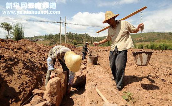 面對(duì)百年一遇的嚴(yán)重旱情,云南各地積極組織群眾進(jìn)行水利設(shè)施建設(shè),修水溝、清淤泥、建水渠、架設(shè)引水管道,努力化解農(nóng)村人畜飲水困難,確保春耕備耕農(nóng)田灌溉,爭(zhēng)取減輕干旱帶來(lái)的損失。新華社記者 藺以光 攝
