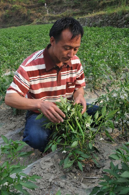 圖為村民王鳳興展示長勢良好的辣椒(4月7日攝)。
