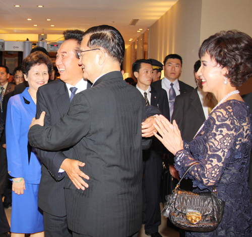 4日晚間,國(guó)民黨榮譽(yù)主席連戰(zhàn)在臺(tái)北國(guó)賓飯店宴請(qǐng)海協(xié)會(huì)會(huì)長(zhǎng)陳云林一行。這是連戰(zhàn)與夫人在宴會(huì)廳入口迎接陳云林與夫人,兩位老朋友在臺(tái)灣熱情相擁。(田云鵬 攝)
