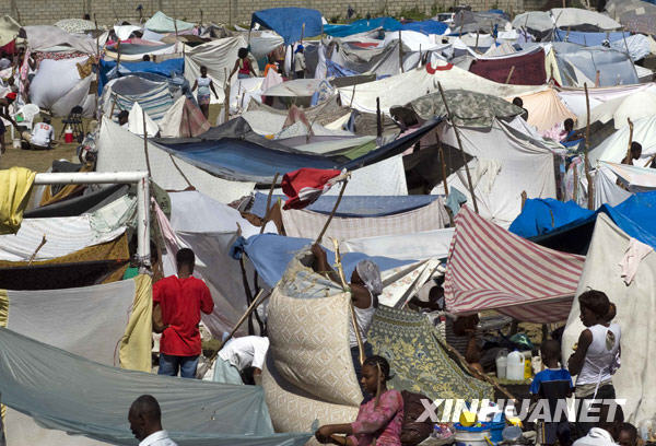 1月16日,在海地首都太子港一家公園內(nèi)的安置點,災民在帳篷里生活。新華社發(fā)(戴維攝)