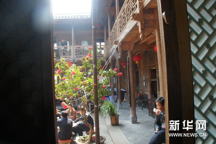 大宅的天井里也是人們聚會品茶的好場所,將喧囂與繁華隔絕在外。只要那高掛的燈籠和嬌艷的茶花依然繁華。楊藝華攝