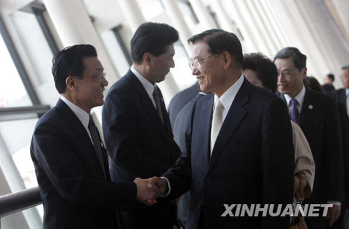 4月29日,江丙坤(右)與前來送行的海協會駐會副會長李炳才握手道別。新華社記者邢廣利 攝