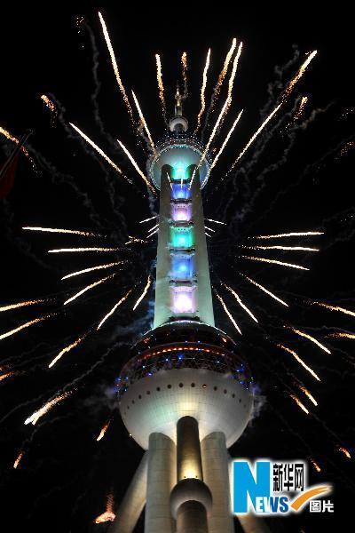 4月30日晚,東方明珠塔被燈光、焰火裝扮得分外美麗。當晚,中國2010年上海世博會開幕式大型燈光噴泉焰火表演在上海舉行。