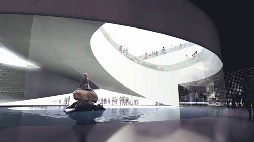 丹麥館名為“夢想城市”,將如同一本生動的童話書,帶領參觀者親身體驗丹麥的城市生活。孩子們可以在廣場上自由自在地玩耍,參觀者可以享用一頓野餐,并讓“海港”的海水輕撫腳趾,而在水中央,還端坐著從丹麥遠道而來的貴客——小美人魚。在這里,參觀者可以選擇步行或自行車兩種不同的速度,由表及里地欣賞丹麥館。蹬上自行車穿梭于這座雙螺旋型的建筑,從地面盤旋到達十二米的高度,又盤旋而下回到地面,掠過城市的生活,細細體味周遭的一切。