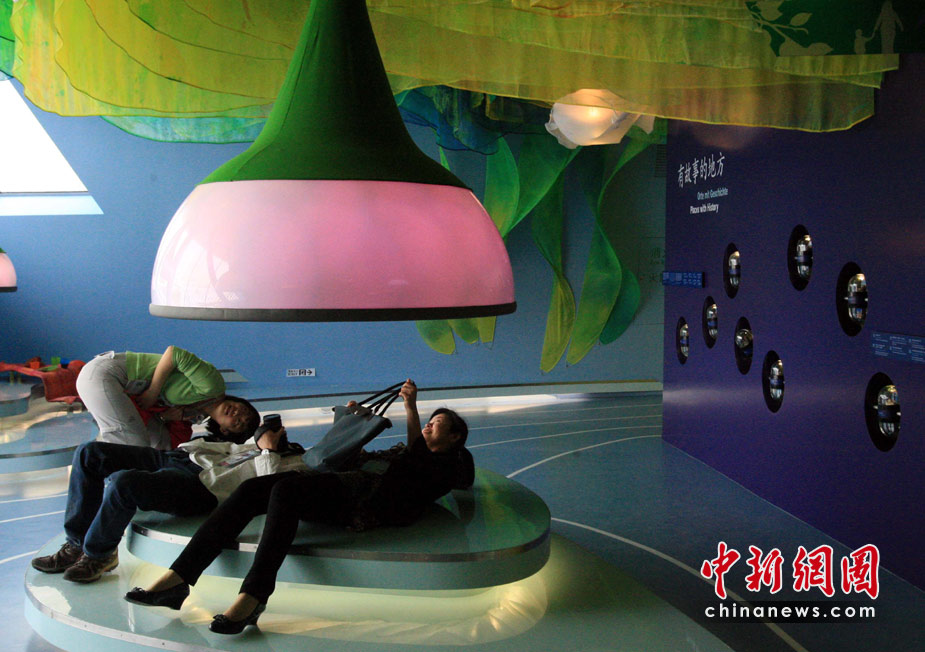 4月27日,三位年輕女記者在上海世博會德國館內以各種獨特的姿勢探秘故事。當天,上海世博會組織者特邀注冊媒體參觀部分場館。中新社發 潘索菲 攝