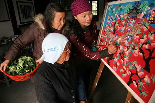 3月7日, 位于金山楓涇中國農(nóng)民畫村、上海市首批“世博農(nóng)家示范戶”的女主人王美英的90歲婆婆錢引珍,趁著難得的好天氣,特意來到畫村“丹青四號(hào)”,觀賞孫女陳惠芳即將完成的世博題材農(nóng)民畫《桃園迎來四方客》,陳惠芳不時(shí)向兩位長輩請教,祖孫三代女畫家在一起切磋畫技,其樂無窮。陳惠芳高興地說,這也是獻(xiàn)給世博年“三八婦女節(jié)”的一份很有意義的禮物。