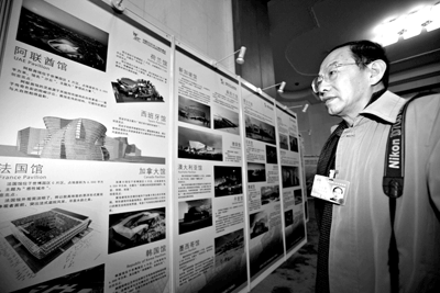 一名人大代表在人民大會堂一層走廊設(shè)置的上海世博會場館介紹展板前觀看。