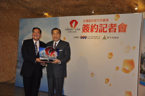 王志剛董事長在簽字儀式后面對媒體表示,臺灣館的同仁辛苦了大概一年的時間,大家日以繼夜,能夠爭取到很多很多的榮譽。事實上,世博臺灣館,我們發揮了一個很大的作用,就是讓兩岸人民,借臺灣館相互更加的了解。很多大陸的同胞,就是在這棵樹底下喝茶,他們邊喝邊說,“哎,我們老家也是這樣的”。聽到這個話,我們也感覺到非常榮幸。現在,我們要把“女兒”嫁出去了,真有點不舍得。當然,既然要嫁,我想總要嫁一個有文化的家庭吧,那新竹市,就是臺灣最重要的科技大城,也是臺灣最重要的文化大城,也是臺灣最重要的學術大城。嫁女兒總要嫁得近一些,而新竹市距離臺北市很近,而新竹本身條件非常好,觀光的資源也好,將來很可能變成大陸觀光客一下桃圓機場,就想到新竹去看臺灣館,新竹很有可能變成大陸同胞觀光臺灣的“第一站”。