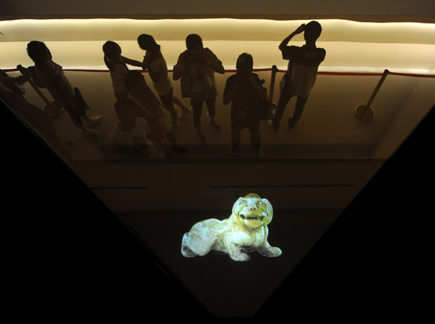 6月27日,游客在震旦館參觀由全息成像技術再現的玉器三維圖像。新華社記者 燕雁 攝
