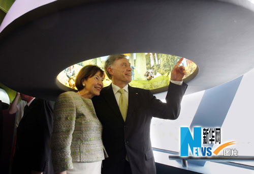 資料圖片:2010年5月19日,德國總統克勒夫婦在德國館內參觀。新華社記者 劉穎