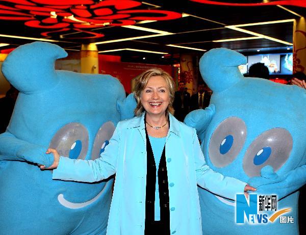5月22日,美國國務卿希拉里·克林頓在上海世博園中國館參觀時與“海寶”親密接觸。 新華社記者張明攝