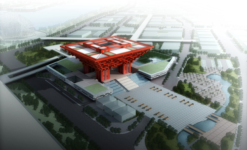 中國館建筑外觀以“東方之冠”的構思主題,表達中國文化的精神與氣質。國家館居中升起、層疊出挑,成為凝聚中國元素、象征中國精神的雕塑感造型主體——東方之冠;地區館水平展開,以舒展的平臺基座的形態映襯國家館,成為開放、柔性、親民、層次豐富的城市廣場;二者互為對仗、互相補充,共同組成表達盛世大國主題的統一整體。國家館、地區館功能上下分區、造型主從配合,空間以南北向主軸統領,形成壯觀的城市空間序列,形成獨一無二的標志性建筑群體。