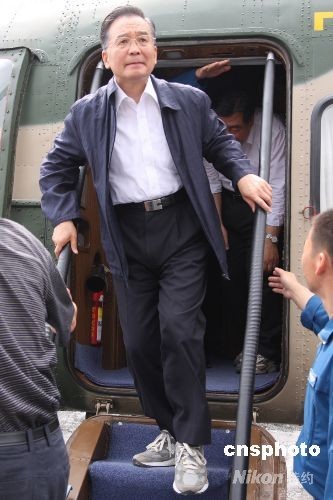 5月24日,中國總理溫家寶乘成都軍區陸航團的直升飛機抵達汶川大地震重災區映秀鎮,與聯合國秘書長潘基文會晤。中新社發 賈國榮 攝