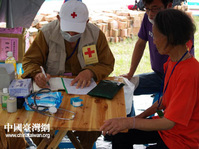 20日下午,臺(tái)灣紅十字組織醫(yī)療隊(duì)帶約3噸醫(yī)療用品等物資前往廣漢市,21日在高坪鎮(zhèn),23日在體育場(chǎng)救災(zāi)點(diǎn)設(shè)立醫(yī)療救護(hù)站,展開(kāi)救護(hù)服務(wù)。救護(hù)站設(shè)有中、西醫(yī)。從21日至24日共計(jì)診治476名。對(duì)數(shù)十名老弱災(zāi)民進(jìn)行體檢,做了一臺(tái)氣胸手術(shù)、兩個(gè)骨折手術(shù)。和一個(gè)頭皮縫合小手術(shù)。內(nèi)、外科,兒科,針灸,急處方發(fā)藥點(diǎn)。巴蜀音像制作中心 蘭志泉 攝