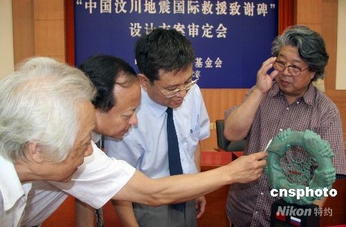 中國(guó)人權(quán)發(fā)展基金會(huì)當(dāng)天在北京舉行“汶川地震國(guó)際救援致謝碑”設(shè)計(jì)方案審定會(huì),由中國(guó)雕塑學(xué)會(huì)名譽(yù)會(huì)長(zhǎng)、中央美術(shù)學(xué)院雕塑系教授曹春生領(lǐng)銜設(shè)計(jì)的“汶川地震國(guó)際救援致謝碑”模型揭開面紗。曹春生介紹說,致謝碑以五雙相握的手支撐起的青銅圓環(huán)為主體造型,寓意世界五大洲心手相連、共抗災(zāi)難,致謝碑基座刻有中國(guó)及受贈(zèng)國(guó)國(guó)旗,并用兩國(guó)語(yǔ)言鐫刻紀(jì)念碑文以及受贈(zèng)國(guó)救援或醫(yī)療隊(duì)隊(duì)員名字。致謝碑總高不小于三米,主體雕塑與基座比例約一比一,一般將選擇放置于受贈(zèng)國(guó)一處戶外的公共場(chǎng)所。