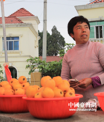 白玉村民在路邊向游客銷售枇杷。她家里有100多棵枇杷樹,今年收成不錯,收入可以有2—3萬元。 (中國臺灣網(wǎng) 田云鵬 攝)