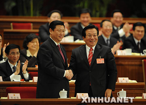 3月15日,十一屆全國人大一次會議在北京人民大會堂舉行第五次全體會議,選舉第十一屆全國人民代表大會常務委員會委員長、副委員長、秘書長;選舉第十一屆全國人民代表大會常務委員會委員;選舉中華人民共和國主席、副主席;選舉中華人民共和國中央軍事委員會主席。這是習近平當選中華人民共和國副主席后,曾慶紅與習近平握手。 新華社記者李學仁攝(組圖)