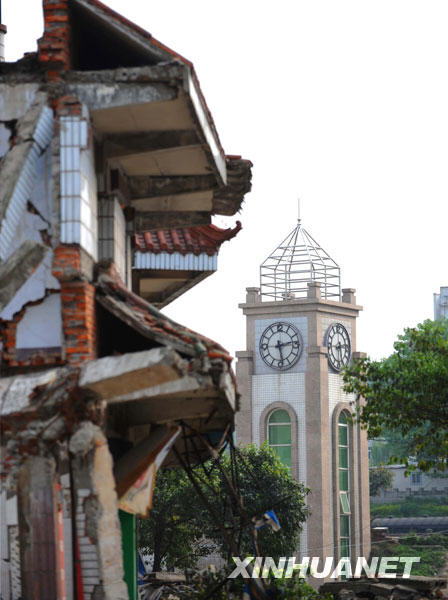 這是5月3日拍攝的綿竹市漢旺鎮(zhèn)廢墟和鐘樓。新華社記者陳燮攝